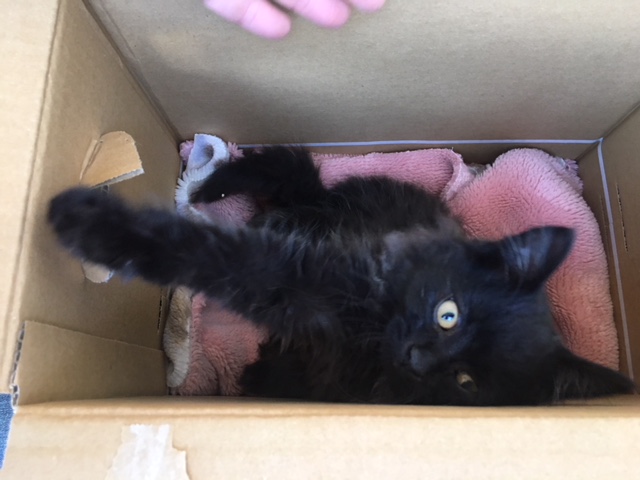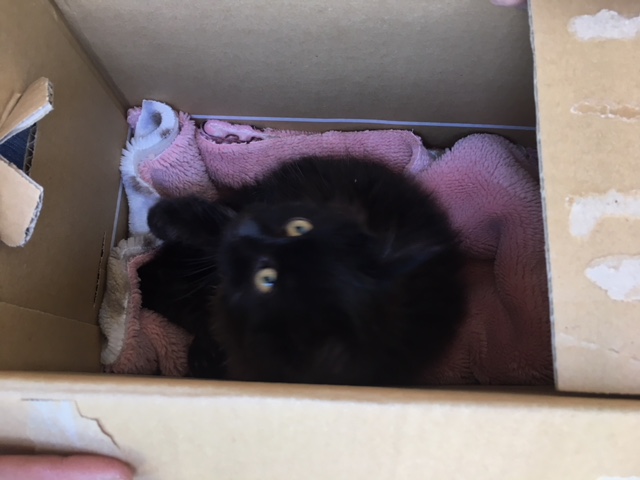 段ボールには、子猫が1匹入っていました。人間を見た途端、大きな声で元気に鳴きます!