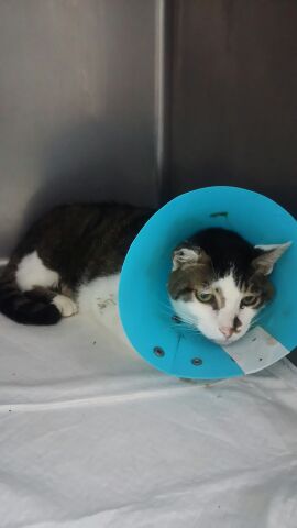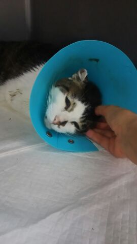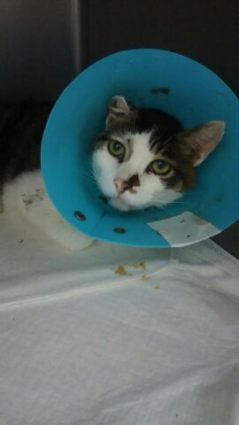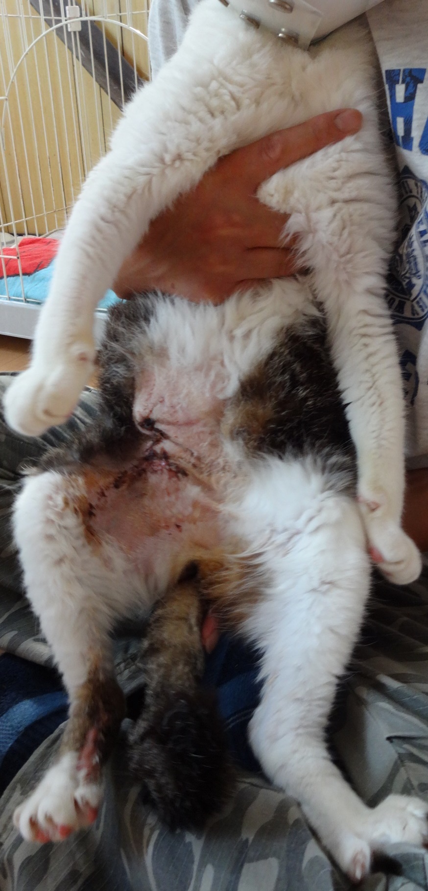 先週に無事退院して、手術したところがふさがるまでの間、手術した所を一日に何度か消毒して、傷口を舐めないようにカラーはつけたままケージの中で過ごしていました。